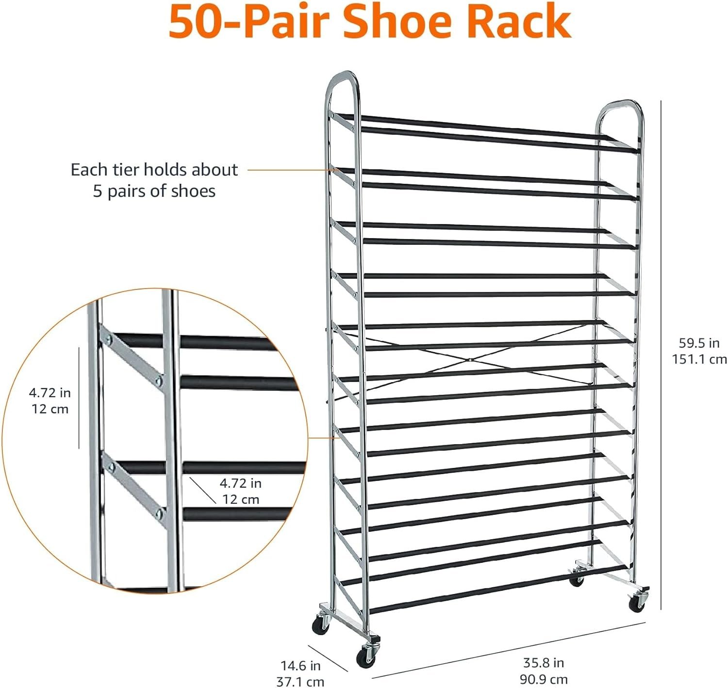 The Amazon Basics 50-Pair Shoe Rack Organizer is a spacious and sturdy solution for keeping your footwear neatly arranged. Made from durable metal with a sleek chrome finish, this free-standing rack features 10 tiers and a portable, rolling design with locking wheels—perfect for use in any room or closet. With its generous 50-pair capacity and convenient mobility, it’s an ideal choice for households seeking organization and style. Upgrade your storage game with this high-capacity organizer from the Amazon Basics Store!